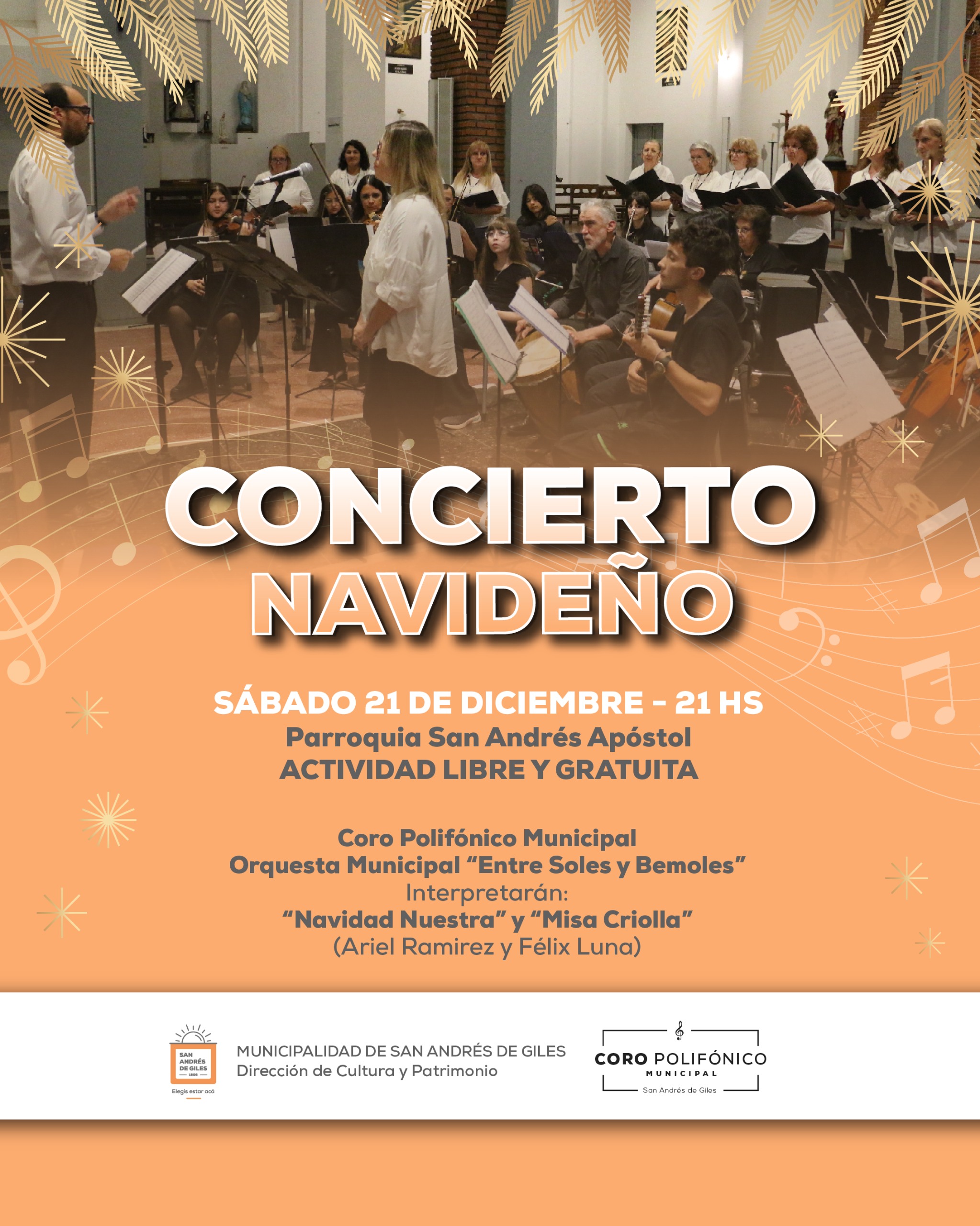 La Dirección Municipal de Cultura y Patrimonio invita a la Parroquia San Andrés Apóstol este sábado 21 de diciembre a las 21:00 horas a disfrutar del Concierto Navideño. Las interpretaciones estarán a cargo del Coro Polifónico Municipal y la Orquesta Municipal “Entre Soles y Bemoles”, ambas dirigidas por David Morelli.