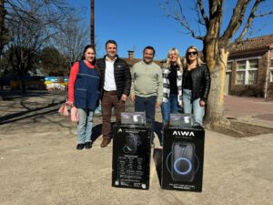 Posteriormente fue a la EES N° 8 Félix Paladino, donde entregó dos parlantes inalámbricos con micrófonos. Estuvieron presentes el presidente de la cooperadora Juan Pablo Franco junto a la vocal Lidia Mabel Villegas.